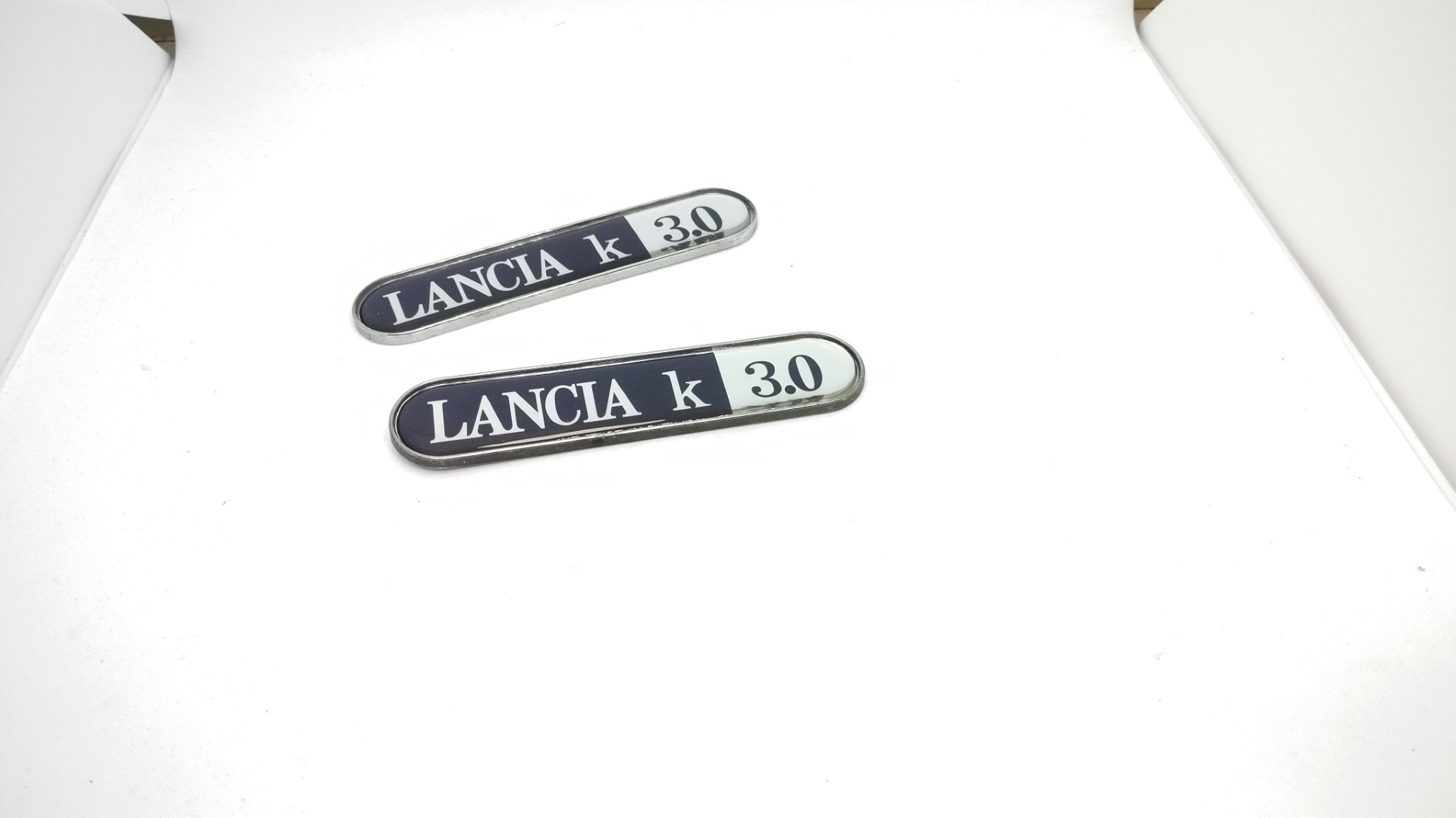 Neu ab Lagerbestand ein originales selbstklebendes Emblem zur Montage am Kotflügel für Lancia Kappa. Opschift ist Lancia K 3.0 OEM Lancia 46415691