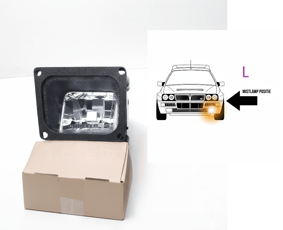 New imitation part. Set of 2 reproduction fog lights for Delta Integrale EVO, so the late square model. Concerns an in-house rebuilt set consisting of a new reflector housing (so no old chrome work, really a fresh new unit) a new plastic housing fitted with a replica plexiglass pane fitted with the original print as it came from the factory. and finished with a new plastic finishing frame. Concerns a set of Left and Right. OEM Lancia 82468777 OEM Lancia 82468776