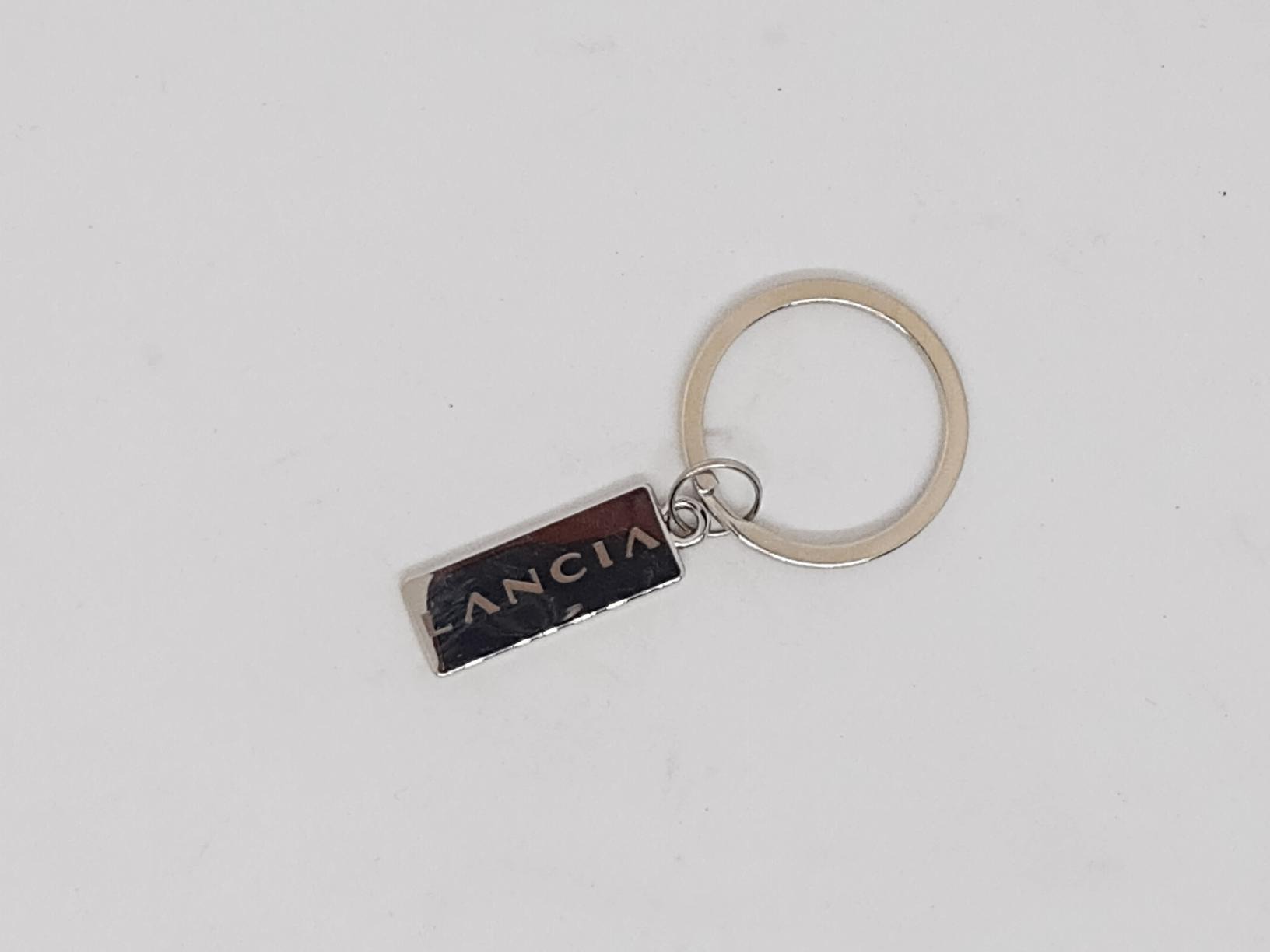 Nieuw imitatie onderdeel. rechthoekige metalen sleutelhanger voorzien van lasergravure van het moderne Lancia logo zoals geintroduceerd bij de lancering van de nieuwste Ypsilon de 4e generatie modelcode L21. Tweezijdig gelaserd, dus aan beide kanten zit het logo! Gewicht 9 gram Afmeting hanger 30x10mm