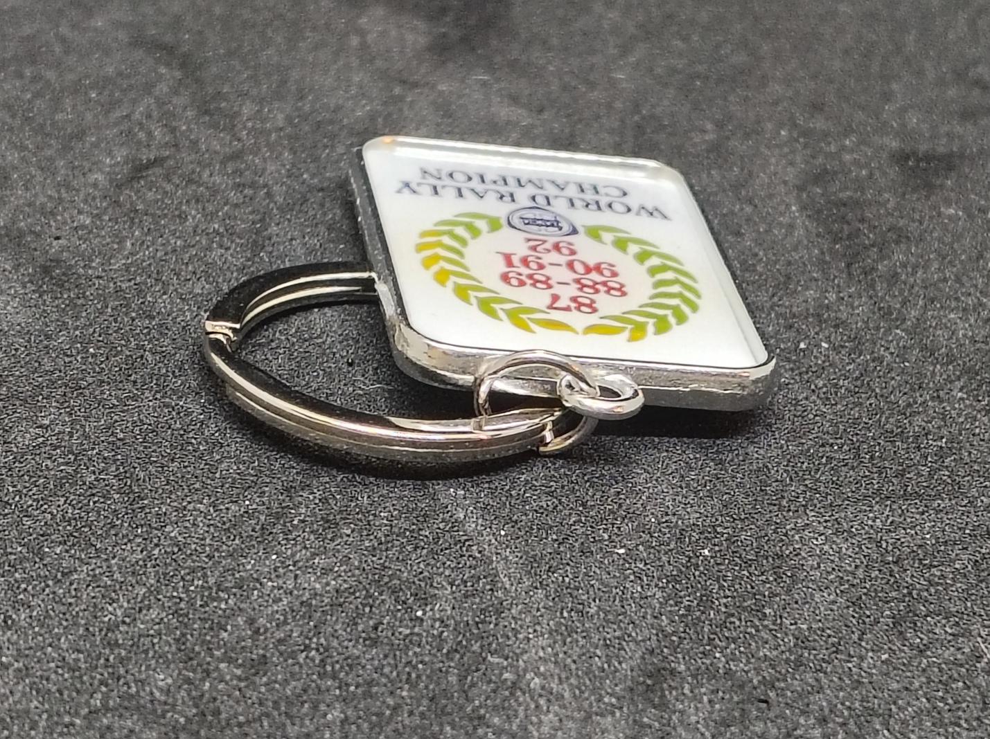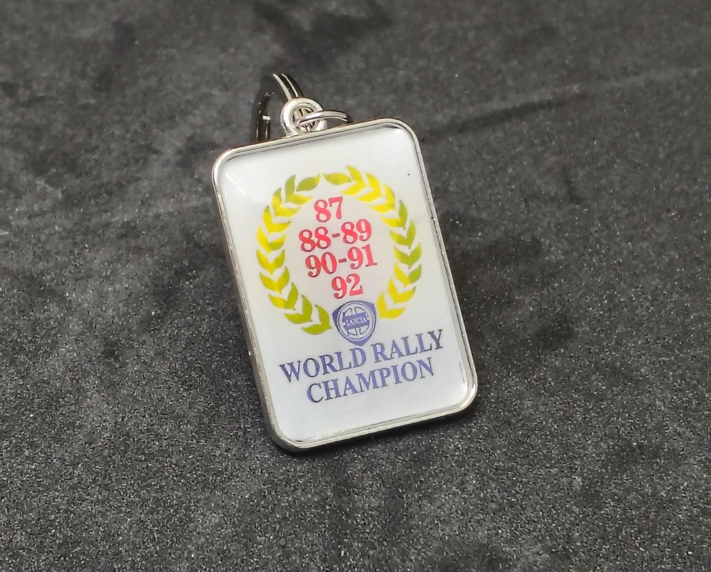 Sleutelhanger Lancia 6 keer Wereldkampioen Rally dubbelzijdig voorzien van lauwerkrans en de jaartallen 87, 88, 89, 90, 91, 92.