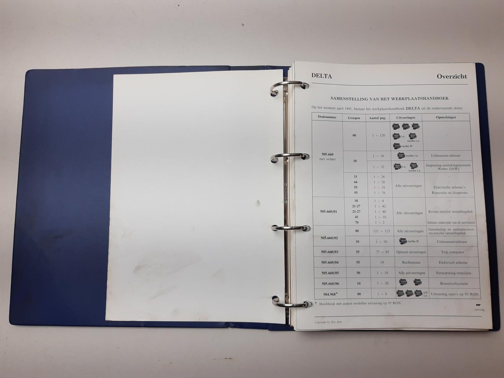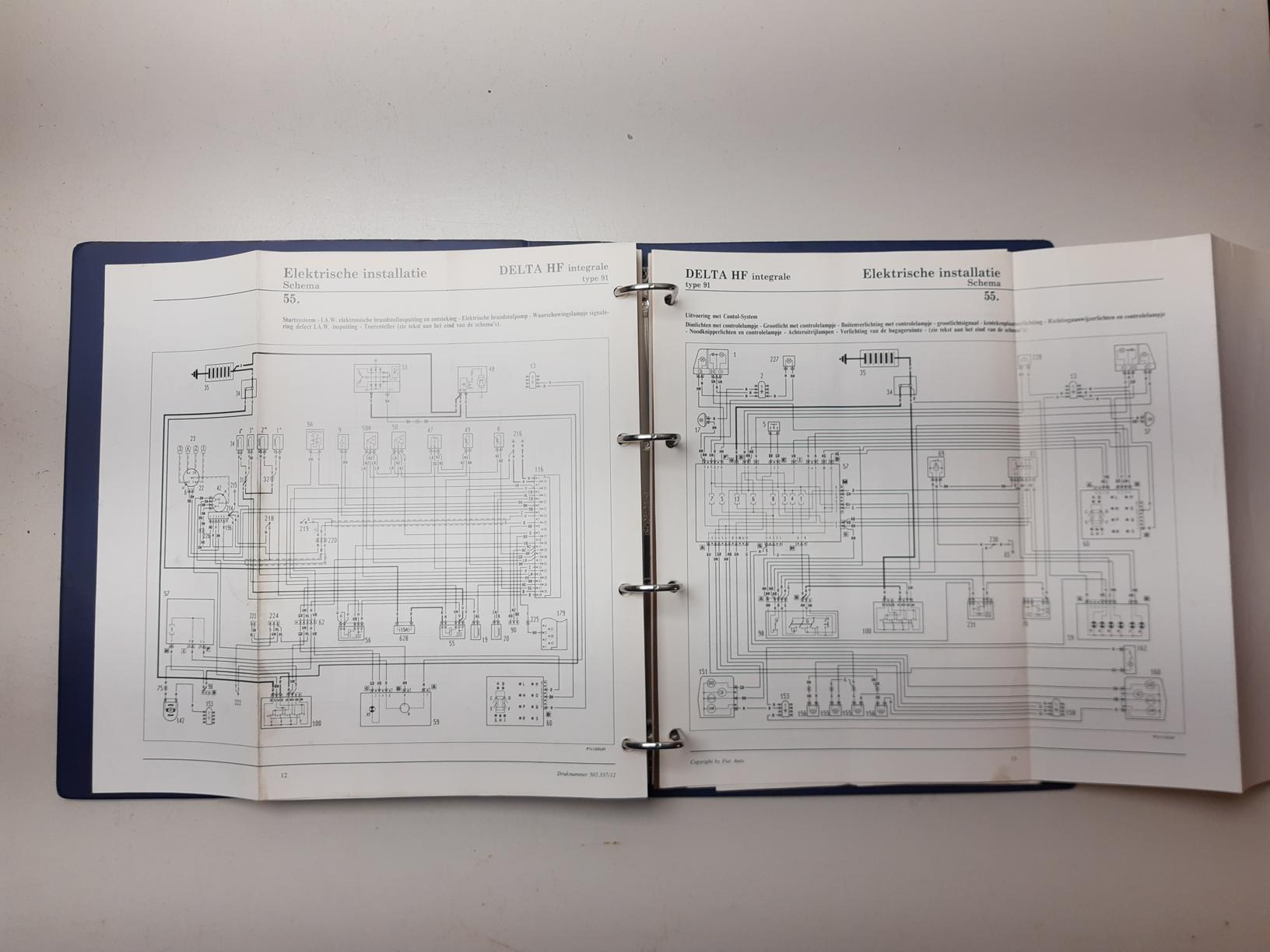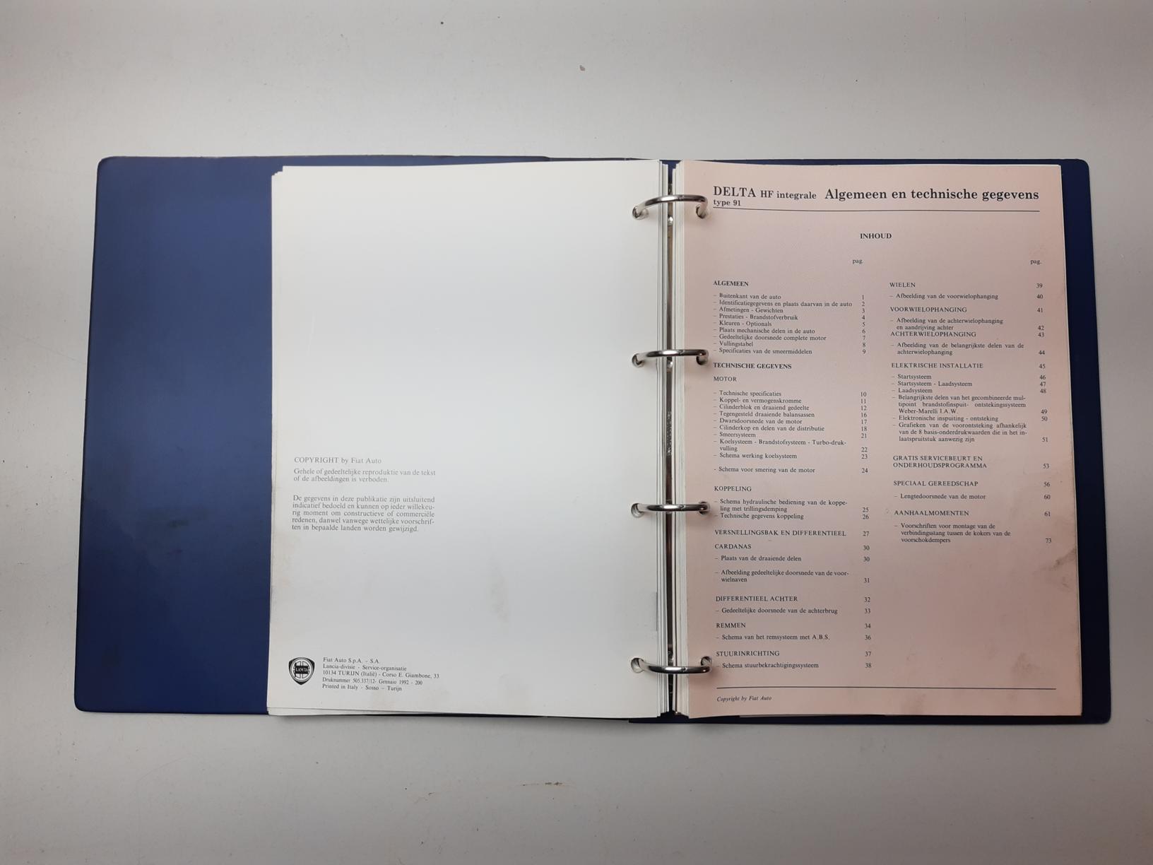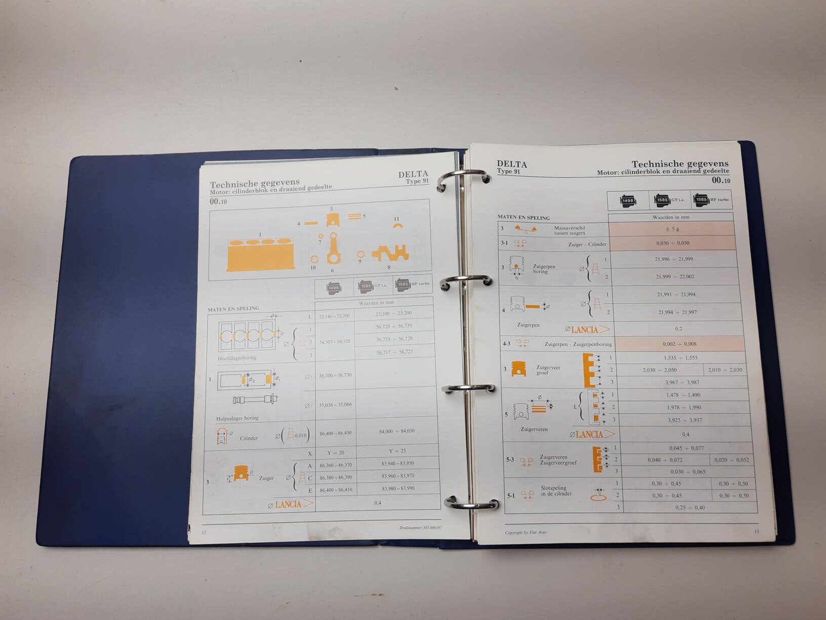 Gebruikt origineel artikel. Uitgave van Fiat Auto in het Nederlands. Werkplaatshandboek in originele blauwe ordner. Uitgave van april 1991 behandeld de toen leverbare modellen met 2 wiel aandrijving en benzine motoren, dus in dit boek staat niets over de Integrale! Het boek behandeld de 1.5, de GT i.e. en de HF Turbo. Maar ook de Delta HF Integrale. Mooie uitgave in goede staat met weinig gebruikssporen. Bevat ook een aantal A3 uitklapbare pagina’s met ondermeer de welektrische schema’s. Een onmisbaar naslagwerk voor de sleutelaar! 2 kleurige uitgave, zwart en oranje drukwerk. ongeveer 250 pagina’s. Erg leuk hebbedingetje voor de liefhebber. OEM Lancia nvt